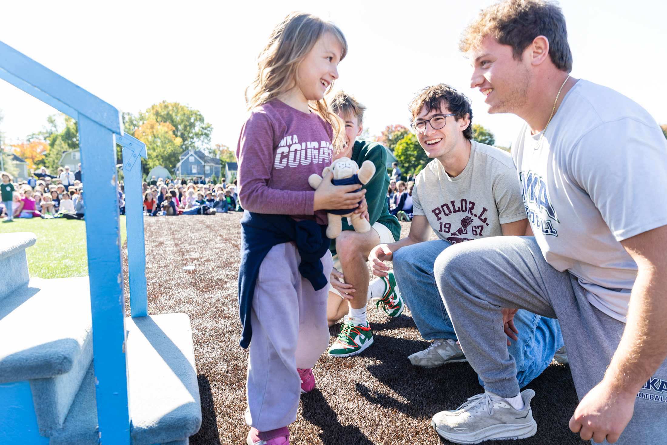 The Pep Band and cheerleaders brought lots of energy to the ceremony, along with a performance by MKA’s acapella group REMIX. The air was filled with pride and unity as voices young and old came together to sing the school’s alma mater, “Oh, MKA,” led by Upper School students Katie Holzer, Alex Crespo, and Nate Chou. Seniors upheld a cherished custom by gifting stuffed cougars to kindergarten students as they made their way across the bridge.