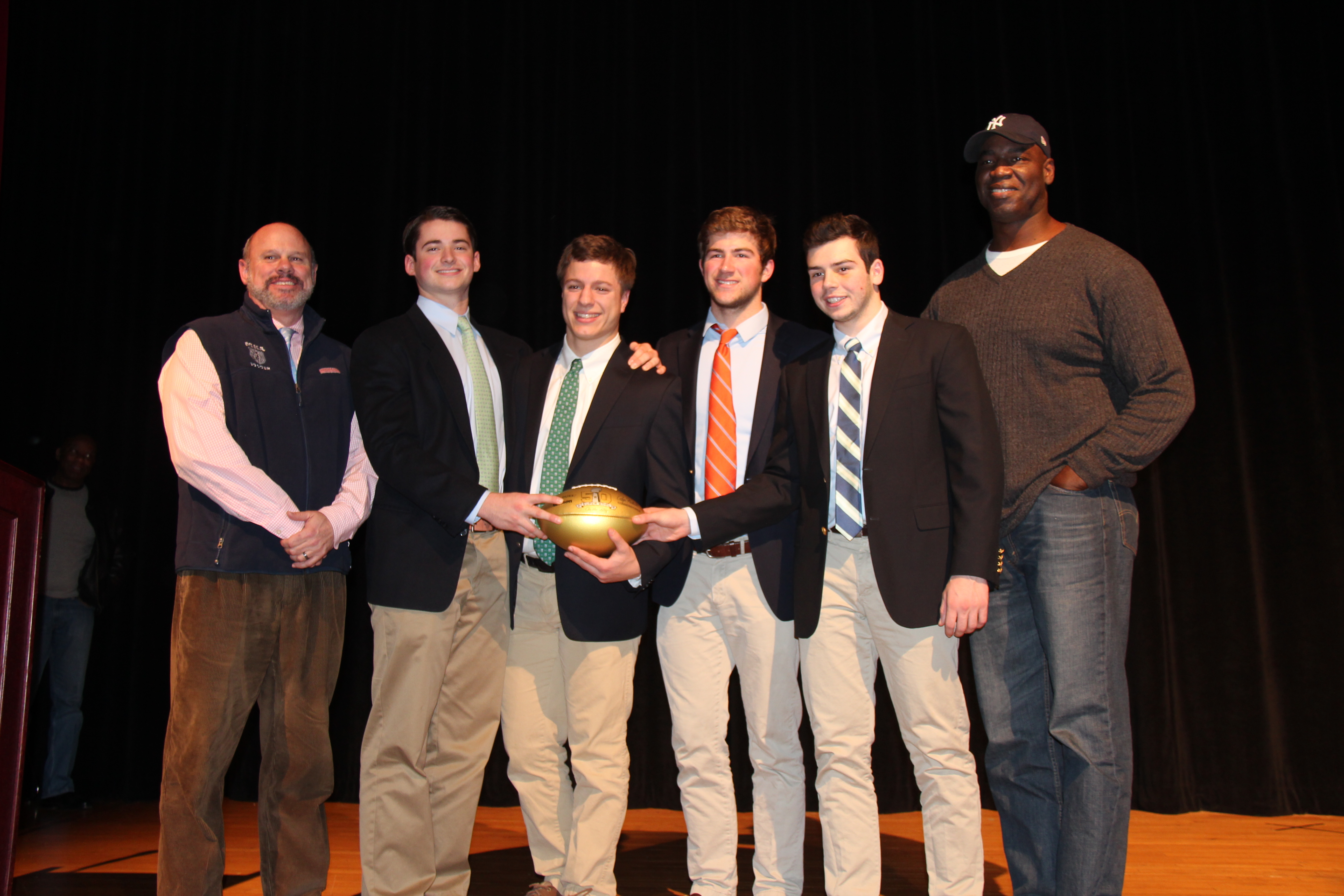 On Monday, February 1st, Sean Jones, a member of the MKA Class of 1980 and a 1996 Super Bowl Champion (Green Bay Packers) , visited MKA's Upper School to present the NFL's 50th Super Bowl Anniversary Golden Ball to senior football captains, Derek Kleinman, Ethan Fusco, Rob Strain and Erik Zueg.