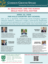 Please register to attend “AI, Education, and the Human Skills That Still Matter,” a Common Ground Speaks panel discussion on Wednesday, April 22, from 6:00 - 8:00 p.m. at Far Hills Country Day School. The moderated panel will bring together national research, classroom insight, institutional leadership, and the parent perspective to examine how AI is transforming education and why human skills matter now more than ever.